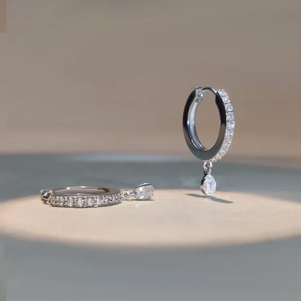 The KE ER 14692 Sterling Silver Lab Grown Diamond Huggie Earrings feature a refined pavé-set hoop design crafted from premium 925 sterling silver. The sleek huggie hoops are adorned with brilliant lab grown diamonds and finished with a delicate oval diamond drop charm, creating a sophisticated and contemporary look.
